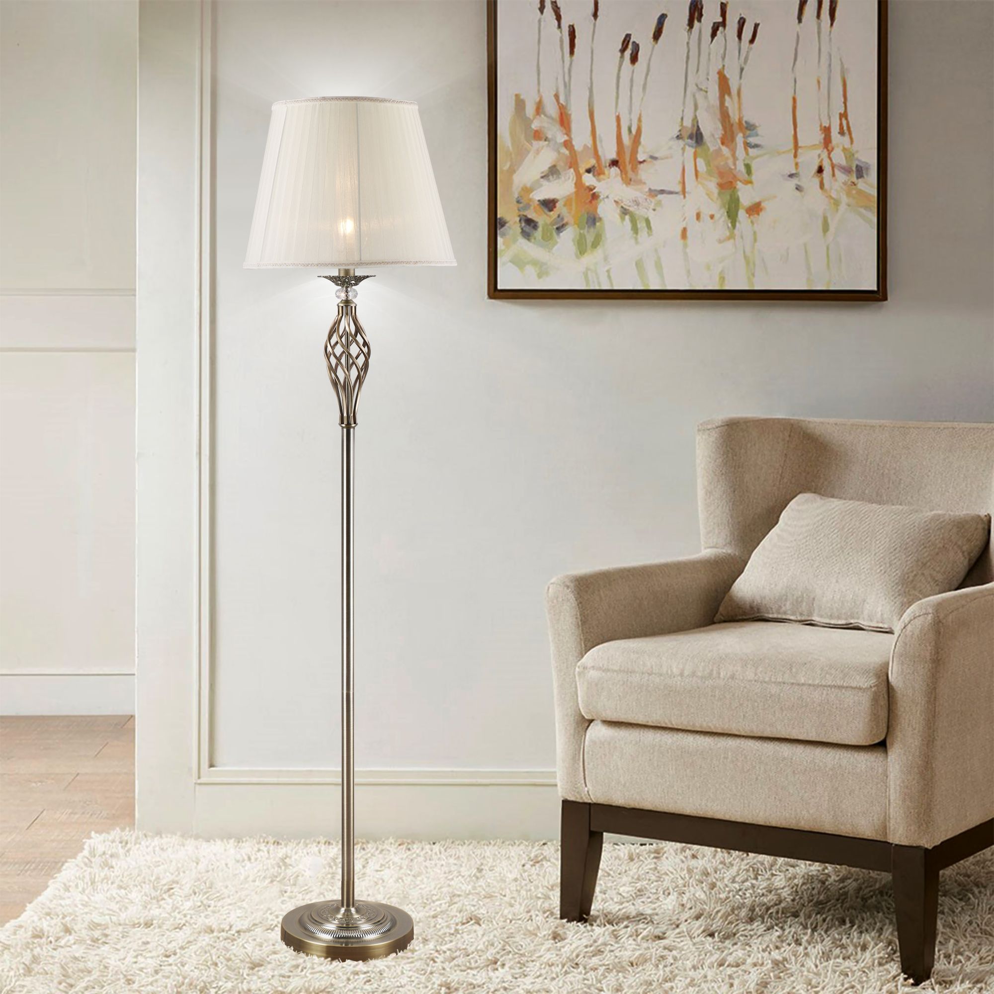 Благодаря бежевому тканевому абажуру напольный светильник создает мягкое равномерное свечение. Прочный металлический корпус светильника устойчив к механическим воздействиям, а защитное покрытие обеспечивает надежную электроизоляцию и презентабельный внешний вид.