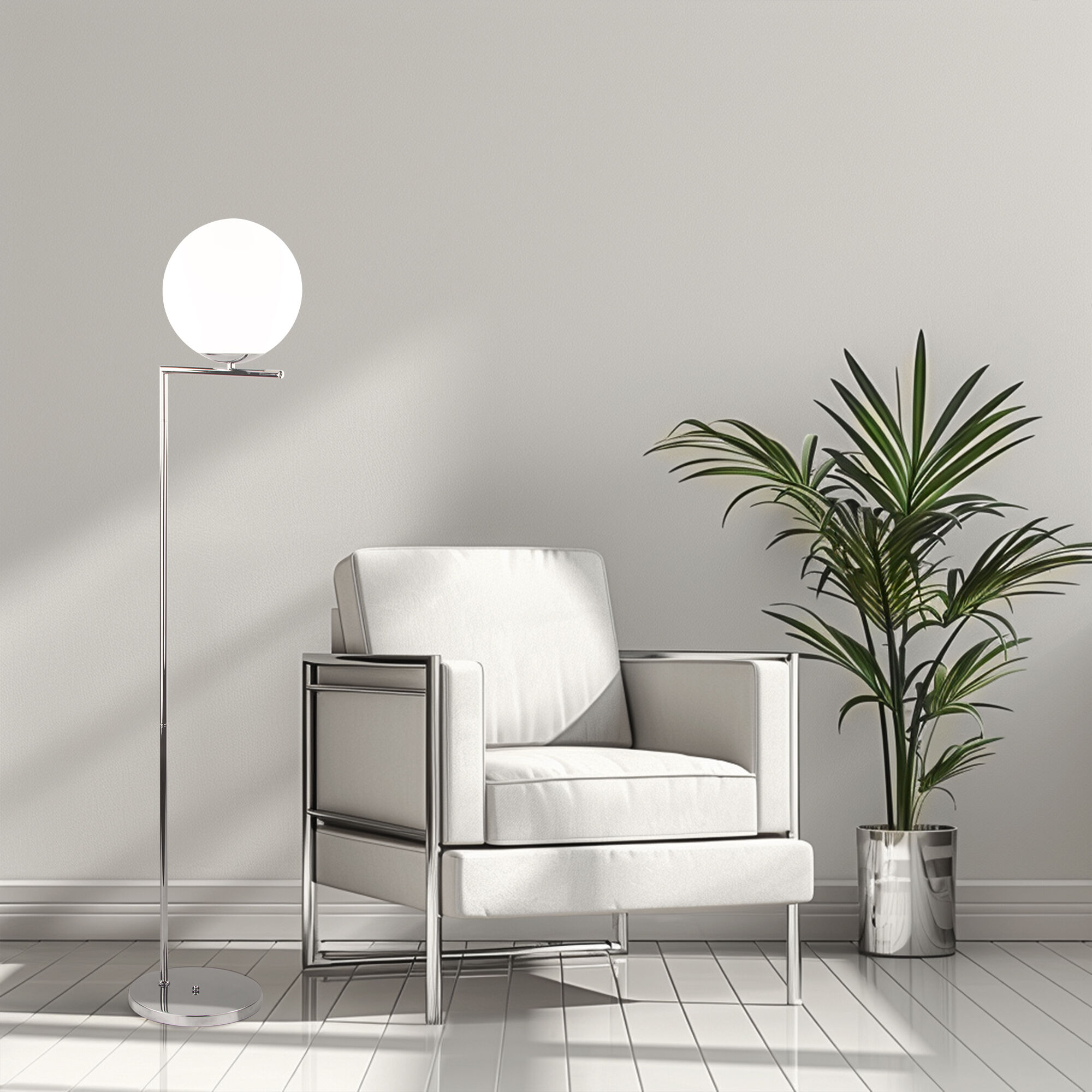 Благодаря белому стеклянному плафону напольный светильник создает мягкое рассеянное свечение. Прочный металлический корпус светильника устойчив к механическим воздействиям, а защитное покрытие обеспечивает надежную электроизоляцию и презентабельный внешний вид.